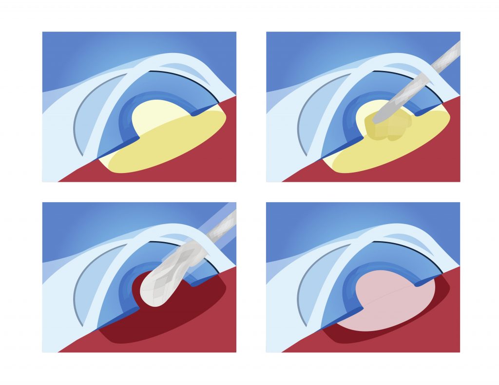 Once the cloudy cataract lens has been removed, an artificial intraocular lens (IOL) is folded and inserted (through the same incision) into the eye in its place. Usually, the incision will not need stitches.